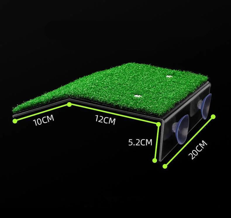 The artificial turf mimics real grass, offering a safe, non-slip surface for turtles and amphibians to climb, bask, and exercise naturally, promoting healthy behavior.