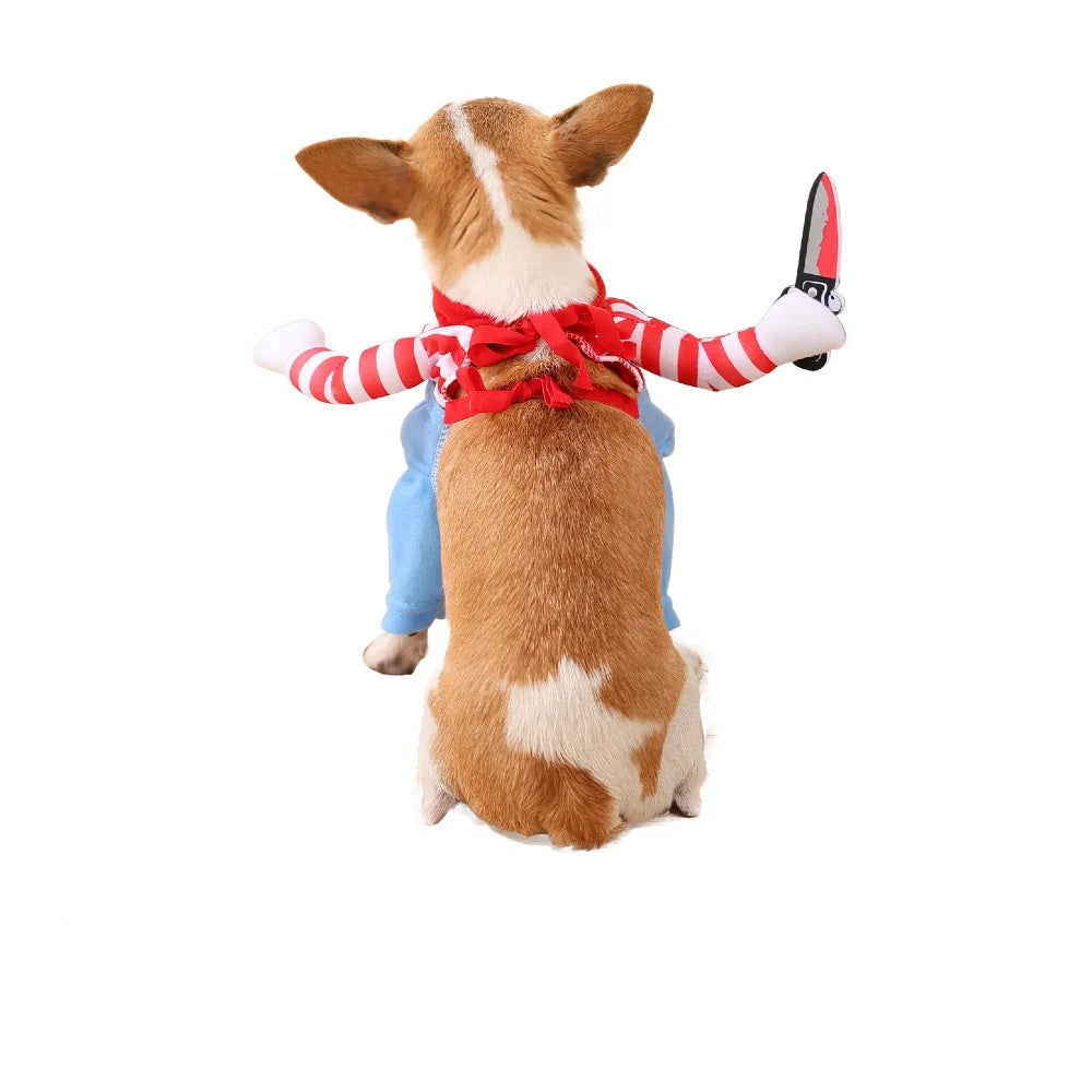Features a knife-holding print and playful cosplay style, transforming your pet into a spooky yet adorable character for Halloween or themed events.
