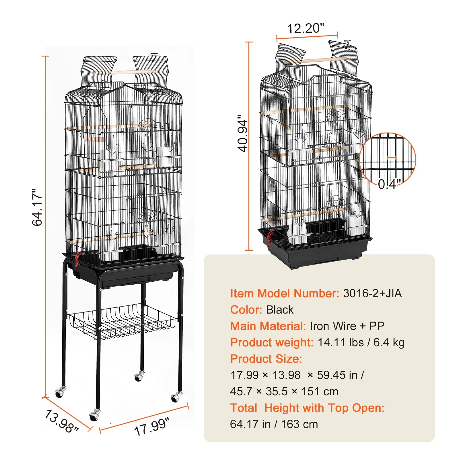Provide your feathered friends with a spacious, safe, and interactive home with the 39-inch Hanging Bird Cage. Designed for small to medium-sized birds, this cage offers ample space for flying, playing, and resting. The top can be opened for free flight, while double doors allow easy interaction with your pets. Equipped with a drawer-style tray and mesh bottom, cleaning is quick and hassle-free. Made from premium iron wire and PP, the cage is durable, rust-resistant, and built to last. Complete with feeders, perches, and a swing, it provides everything your birds need for a happy and healthy life.