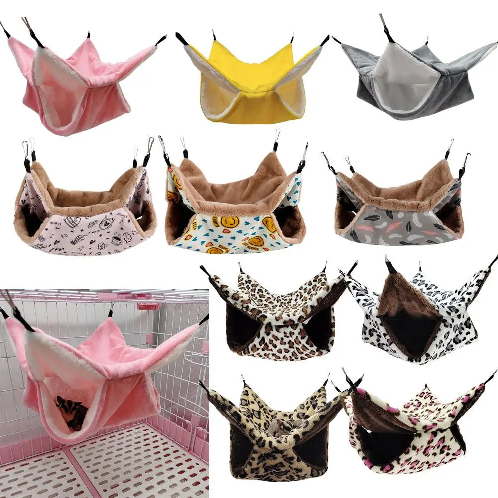 Provide your small pets with a warm, cozy, and fun resting space with this double-layer plush hammock. Perfect for hamsters, rats, squirrels, sugar gliders, and other small animals, it serves as both a comfortable nest and an entertaining stage for play.